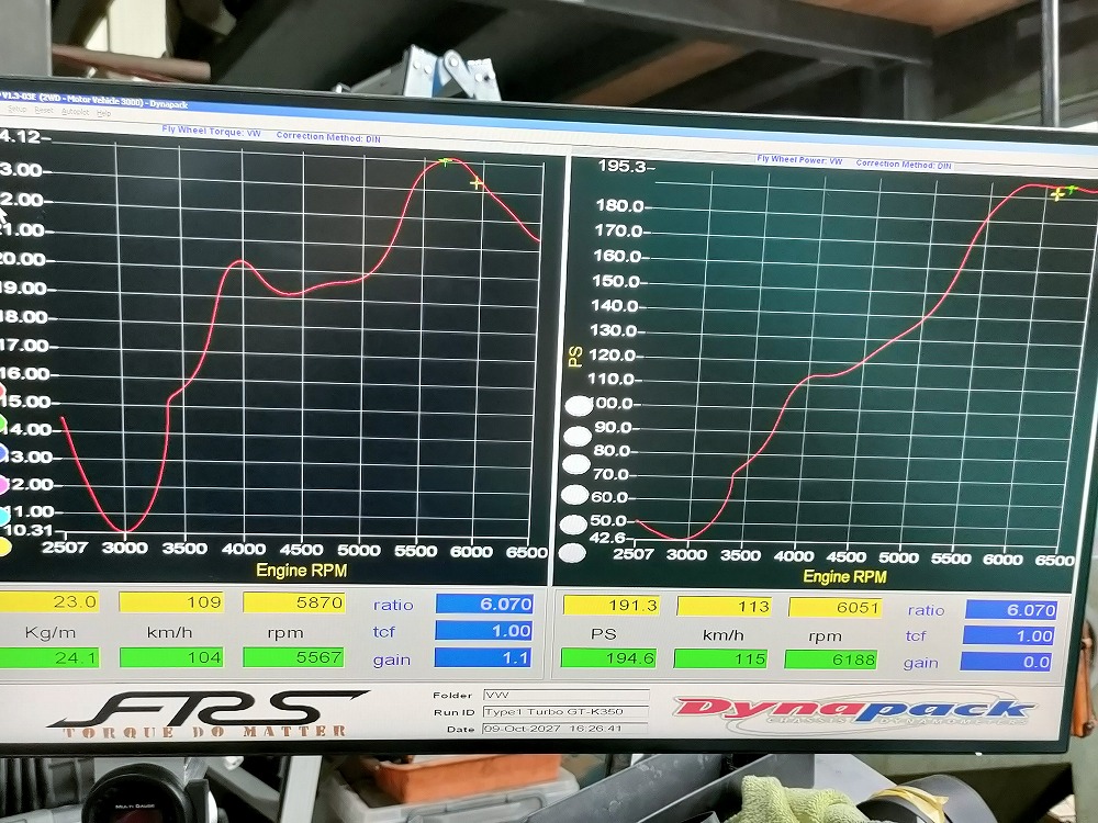 低負荷からセッティングを進め、最終的にブースト0.5キロ弱で200PS程度に。TCF1.2換算だと240PS程。ブーストは4000回転で立ち上がるものの、カムの本領発揮が5500回転から。その辺から結構な振動が出るのでレブリミットは6500回転に。実走セッティングも行いましたが、アイドリング域はカムのせいでトルクがスカスカですが、発進に気を付ければ調子よく乗れるようになりました。車重は恐らく800kg前後なので負圧領域(というか、負圧余り掛からないので低負荷領域w)でもストレスは皆無。しかし、全開かますと真っすぐ走らない。RRでフロントの接地感が怪しい上、ステアリングの遊びもなかなか恐ろしい。それもそのはず、既にノーマル比で出力7.5~8倍です。